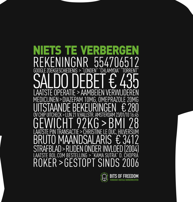 Jullie hebben er even op moeten wachten, maar het was het waard. Het nieuwe Bits of Freedom t-shirt is uit! Koop het hier in de winkel van T-Junk. Het kost EUR 20 en de opbrengsten gaan naar Bits of Freedom. Het t-shirt, dat is ontworpen door Suzero, ziet er zo uit (ook in wit):