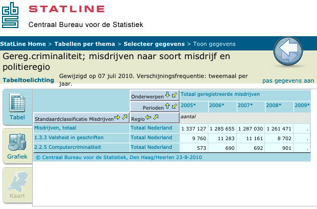 Met 901 geregistreerde misdrijven, maakt ‘computercriminaliteit’ 0.0007% 0.07% van alle criminaliteit in Nederland uit. Niet bepaald veel. In 2008 werden tien keer zoveel gevallen van ‘valsheid in geschriften’ [sic] geregistreerd. En in datzelfde jaar is het aantal breedband internetverbindingen in Nederland blijven stijgen.