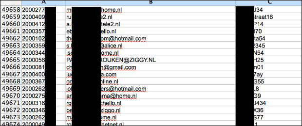 De Excel bestanden bevatten elk een lange lijst van klantnummers, e-mailadressen en wachtwoorden. De bestanden zelf en ook de wachtwoorden zijn niet versleuteld.