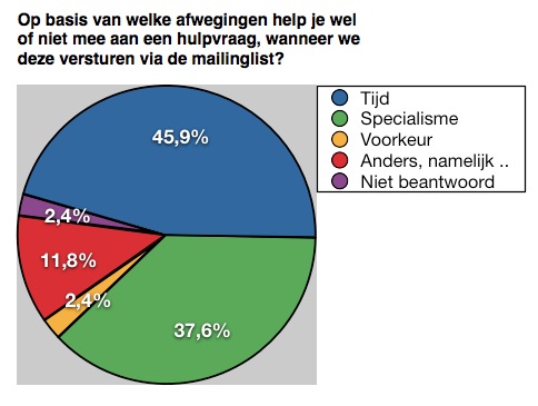 Wanneer wij een vraag sturen, via de vrijwilligerslijsten, helpen jullie voornamelijk wel, of niet, mee op basis van tijd of specialisme. Wanneer jullie als één van de weinigen expertise hebben over een bepaald onderwerp helpen jullie sneller mee, en voorkeur voor een bepaald onderwerp speelt vrijwel niet mee. Als afweging om eventueel niet mee te helpen wordt genoemd dat het vaak lijkt alsof anderen er veel meer van weten, of dat de hulpvraag al vervuld is voordat je tijd hebt.