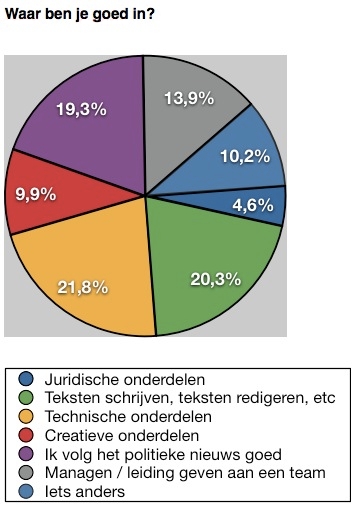 Bijna de helft van jullie (213 reacties) geeft aan goed te zijn in technische vragen. Supporters die graag teksten schrijven en redigeren, en vrijwilligers die het politieke nieuws goed volgen zijn ook veel aanwezig (resp 199 en 198 reacties). Managers en de creatieven zijn minder vertegenwoordigd, maar de kleinste groep zijn juristen. 100 mensen gaven aan een heel andere achtergrond te hebben, waaronder een aantal dat werkzaam is in de zorg- en communicatie-sector en zelfs mensen uit de bouw!
