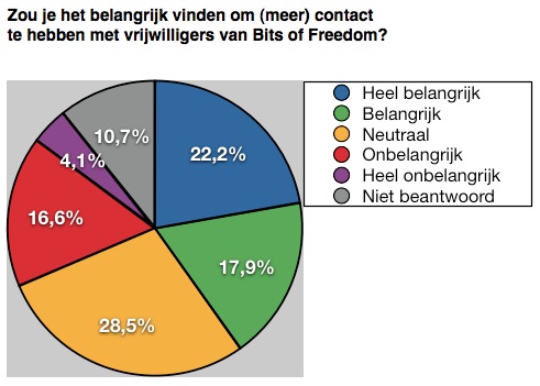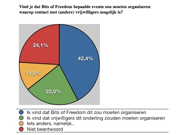 Ongeveer evenveel mensen geven aan offline contact wel en niet belangrijk te vinden. Van de eerste groep, vindt het merendeel dat Bits of Freedom hiervoor een evenement zou moeten organiseren, iets minder dan een kwart vind dat vrijwilligers dit onderling moeten organiseren.