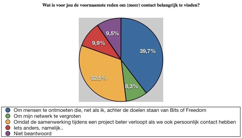 Jullie willen dit contact voornamelijk om mensen te ontmoeten die net als jullie achter de doelen van Bits of Freedom staan. Of omdat de samenwerking binnen een project beter verloopt met persoonlijk contact. Vrijwel niemand zou graag bij een ontmoeting aanwezig zijn met als reden om zijn of haar netwerk te vergroten.