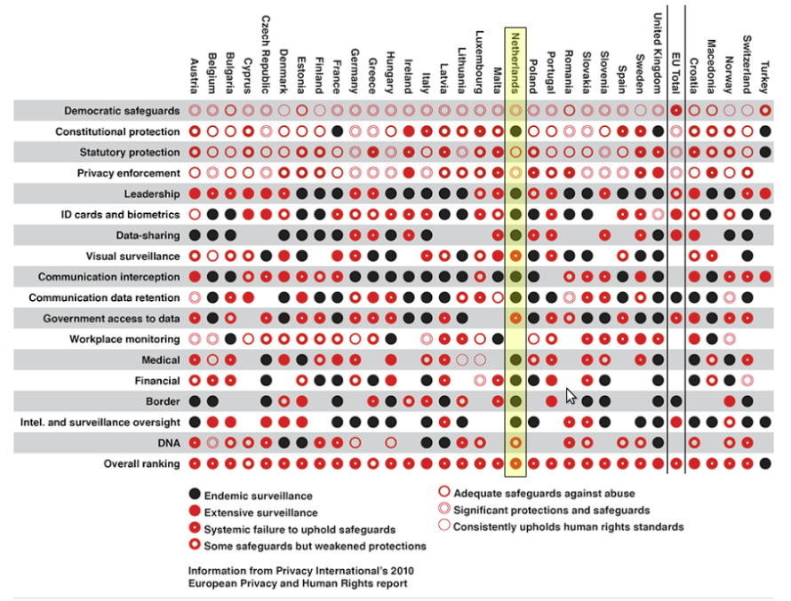 Vorige week schreven we al dat de Europese Commissie voor het eerst een overzicht heeft gegeven van alle privacy beperkende maatregelen van de Europese Unie. Bovendien bindt ze zich aan criteria voor nieuwe vrijheidsinperkingen. Sindsdien werden we gewezen op de onlangs verschenen studie “European Privacy and Human Rights 2010” van de organisatie Privacy International. Hun rapport vormt een mooie aanvulling op de mededeling van de Commissie, aangezien het rapport de toestand van privacy op specifieke onderwerpen in alle afzonderlijke Europese landen in kaart brengt. Zoals in dit staatje :