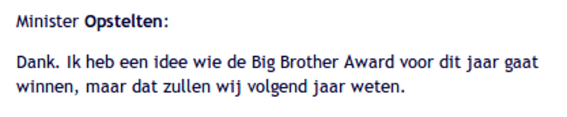 Toen de jury een paar weken geleden de Big Brother Awards aan minister Opstelten uitreikte, kende hij ons nog niet. Dat is snel veranderd. Tot onze grote vreugde deed minister Opstelten afgelopen week al een suggestie voor de volgende Big Brother Award: het rampzalige plan van korpschef Paauw om het DNA van alle Nederlanders op te slaan.