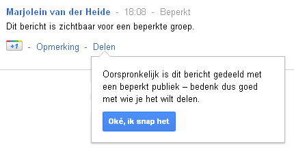 In Google+ is het mogelijk om berichten van andere gebruikers te delen op je eigen profiel. Dit brengt het risico met zich mee dat een bericht, oorspronkelijk bedoeld voor een beperkte groep, volledig openbaar gemaakt wordt door iemand anders. Als je een bericht met beperkte zichtbaarheid wil delen, krijg je een waarschuwing te zien. Hiermee wordt een beroep gedaan op het gezonde verstand van gebruikers, maar wordt niet voorkomen dat berichten ongewenst openbaar worden gemaakt.