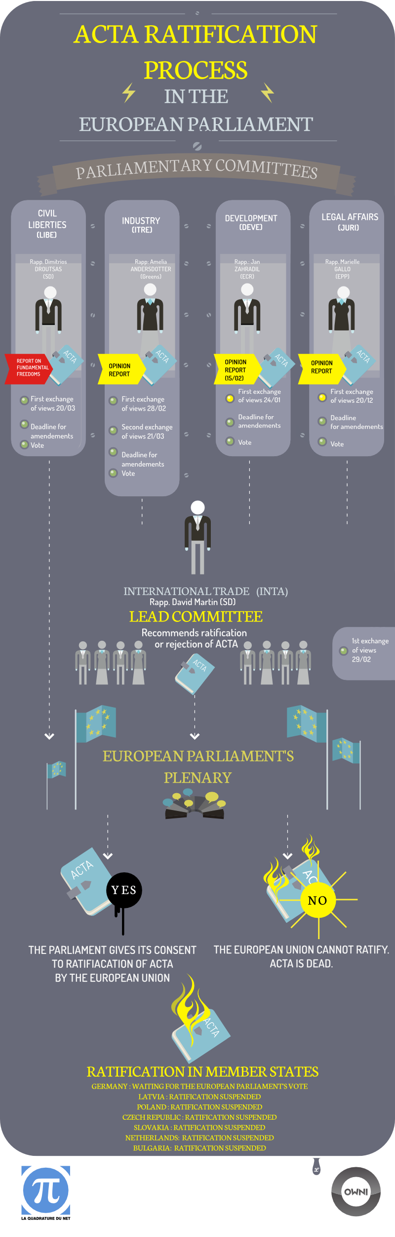 De Rapporteur betrekt bij zijn beslissing over ACTA de mening van vier commissies. De Commissie Juridische Zaken (JURI) en de Commissie Ontwikkelingssamenwerking (DEVE) hebben een positief concept-rapport over ACTA gepubliceerd. Het concept-rapport van Commissie Industrie, Onderzoek en Energie (ITRE) is negatief. De Commissie Burgerlijke Vrijheden, Justitie en Binnenlandse Zaken (LIBE) moet haar concept-rapport nog publiceren. Elke commissie moet het concept-rapport na een “exchange of views” goedkeuren. De commissie kan ook een amendement voorstellen. Niettemin geeft het concept-rapport een goede indicatie van het standpunt van desbetreffende commissie. Op basis van de definitieve rapporten brengt de Rapporteur een concept-rapport uit waar zijn commissie, de Commissie Internale Handel (INTA), naar verwachting op 29-30 mei over zal stemmen. De beslissende stem van het Europarlement volgt ongeveer een week later. Zie ook deze infographic: