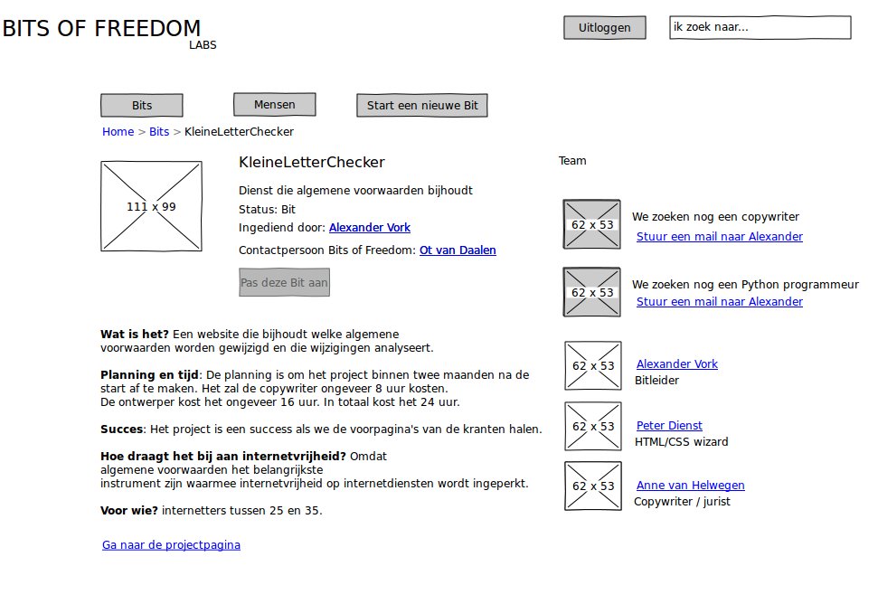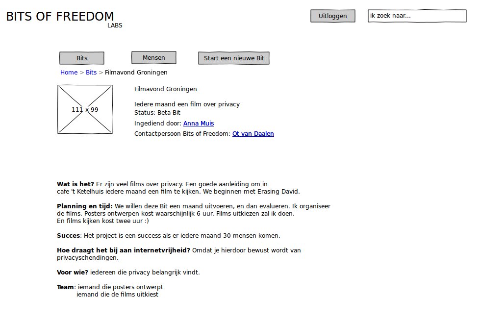 - Dat idee kan jij of iemand anders vervolgens uitwerken tot een beta-Bit: je beschrijft in de template van Bits of Freedom hoe zo een Bit eruit zou moeten zien. Hierin worden alle belangrijke elementen beschreven: wat wil je bereiken, welk probleem wil je oplossen, wanneer is een Bit een succes, wat voor mensen zoek je voor je Bit, etc. Ieder voorstel wordt behandeld door een contactpersoon van Bits of Freedom, en samen werken jullie het voorstel uit tot een Bit: een beschrijving van het project dat door Bits of Freedom moet worden goedgekeurd. We onderzoeken voordat we een Bit goedkeuren of de Bit voldoende concreet is, past bij onze doelen, haalbaar is, etc.