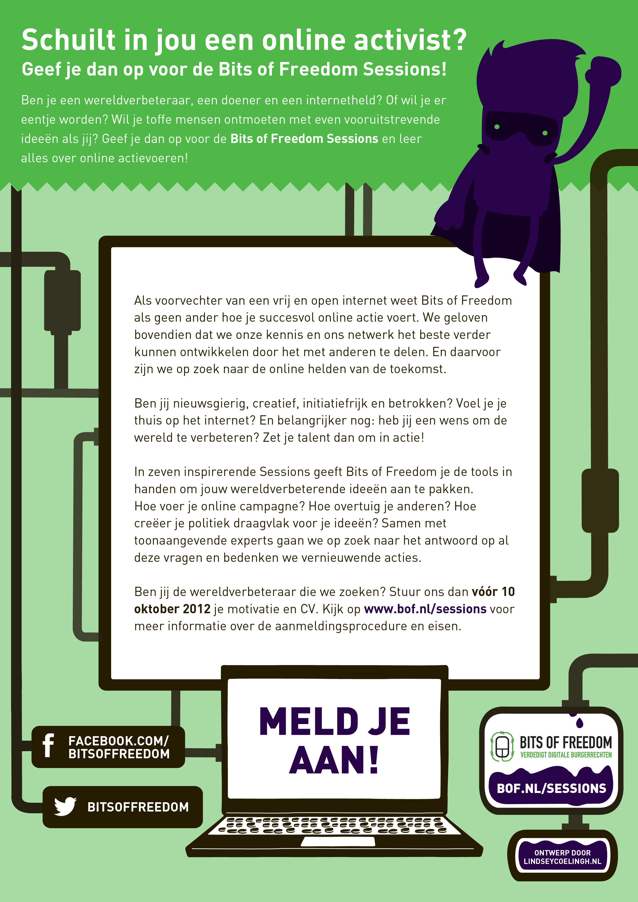 Ben je een wereldverbeteraar, een doener en een internetheld? Of wil je er eentje worden? Wil je toffe mensen ontmoeten met even vooruitstrevende ideeën als jij? Geef je dan op voor de Bits of Freedom Sessions en leer alles over online actievoeren!