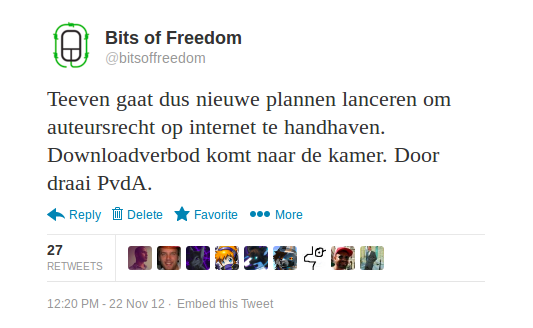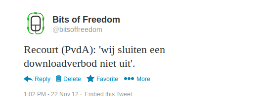 Die motie werd onder meer door de PvdA ingediend. De PvdA schreef ook in haar verkiezingsprogramma dat ze tegen een downloadverbod en websiteblokkades is: