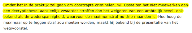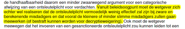 Met andere woorden: minister Opstelten werkt nu aan een wetsvoorstel waarmee slimme criminelen gedwongen kunnen worden om versleutelde bestanden toegankelijk te maken, terwijl het onderzoek er voor waarschuwt dat zo’n dwangmiddel niet effectief zal zijn bij die slimme criminelen. Hoe gek is dat?
