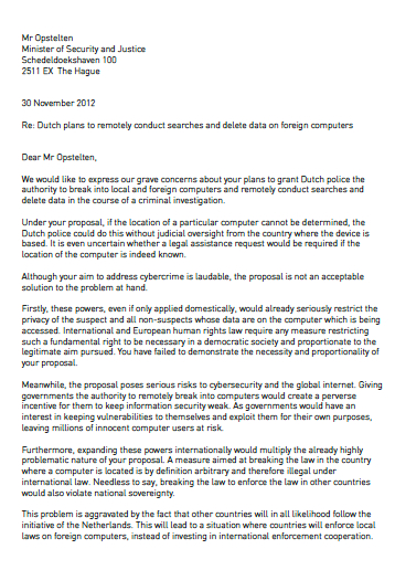 Volgens de internationale coalitie breken de hackplannen in op de mensenrechten en veiligheid van burgers wereldwijd. Dit wordt nog versterkt doordat andere landen het voorbeeld van Nederland zullen volgen en op deze manier hun eigen wetten zullen opleggen in het buitenland. “Dat stopt niet bij cybercrime.” zegt Simone Halink van Bits of Freedom, “Wat houdt andere landen tegen om ook een verbod op homosexualiteit of godslastering in het buitenland te handhaven? Zo verander je het internet in het Wilde Westen”. De internationale coalitie verzoekt de minister dringend zijn hackplannen in te trekken, gelet op de implicaties voor mensenrechten, cybersecurity en het internet wereldwijd.