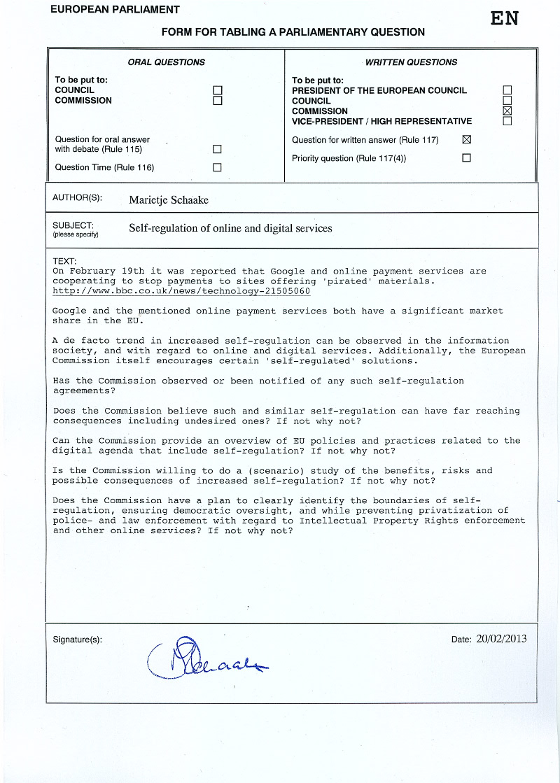 Marietje Schaake stelt daarom kritische vragen hierover aan de Europese Commissie. Zij vraagt onder meer of dit soort zelfregulering ook ongewenste effecten kan hebben, en zo ja: welke. Ook vraagt ze een overzicht van alle zelfregulering op digitaal gebied en vraagt ze of onderzoek kan worden gedaan naar de voor- en nadelen van de toegenomen zelfregulering. Tot slot vraagt ze of de Europese Commissie een plan heeft om democratisch toezicht te waarborgen en te voorkomen dat de handhaving door opsporingsdiensten wordt geprivatiseerd. Nu is de Europese Commissie aan zet.