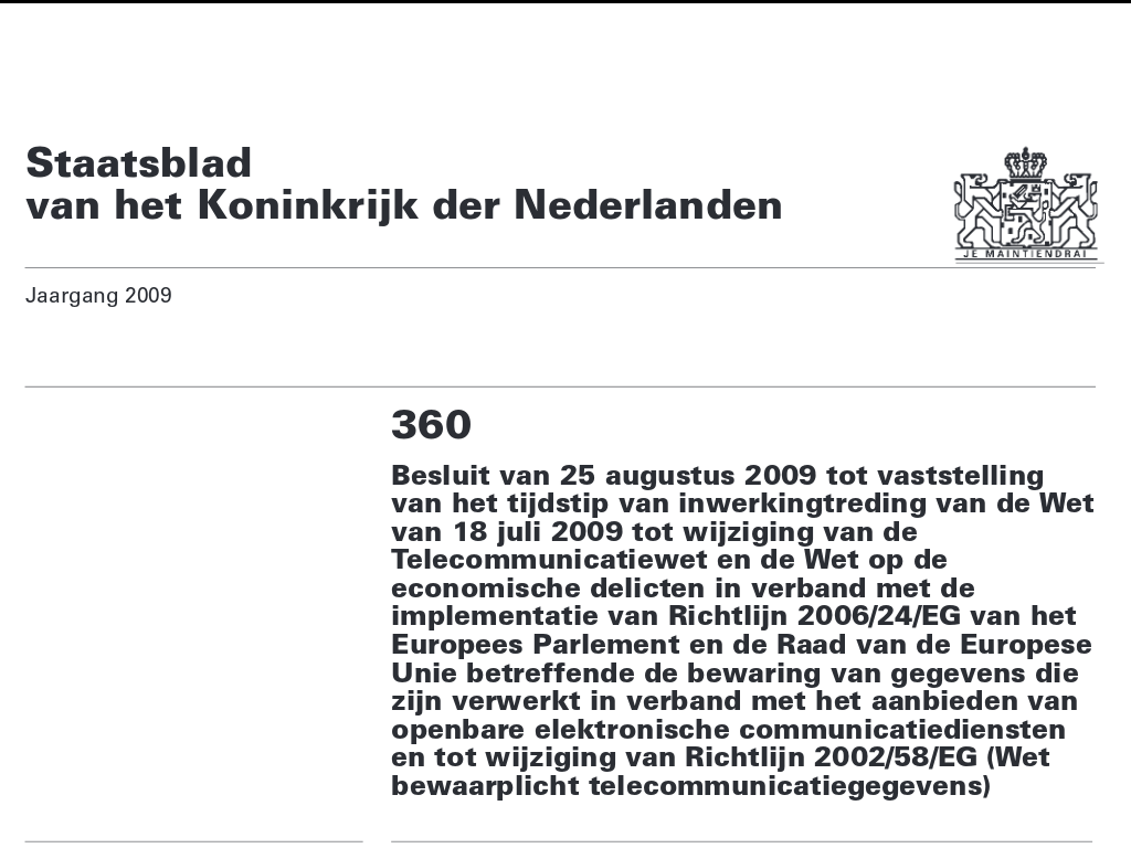 Op 1 september 2009 is, als implementatie van een Europese richtlijn, de Wet bewaarplicht telecommunicatiegegevens in werking getreden. Deze wet verplicht internetproviders en telecomaanbieders tot het bewaren van alle verkeers- en locatiegegevens van hun klanten voor een periode van zes tot twaalf maanden. Als ik nu met u zou bellen moet Vodafone bijvoorbeeld de begin- en eindtijd, de telefoonnummers, de namen en adressen van de betrokken abonnees, en de locaties waar betrokken mobiele telefoons zich bevinden, twaalf maanden bewaren.