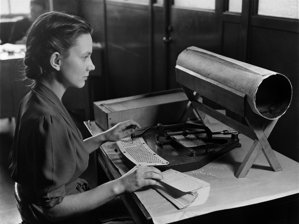 Deze foto komt waarschijnlijk uit 1940. De mevrouw heeft een zogenaamde Hollerithkaart vast. Herman Hollerith was een Amerikaanse uitvinder die zijn proefschift schreef over elektronische optelmachines. In 1889 kreeg hij een patent toegewezen met de titel “Art of Compiling Statistics”. Het komt erop neer dat hij een manier had uitgevonden waarmee je heel snel een bevolkingstelling kon doen. Elke ponskaart staat voor een persoon met eigenschappen (de gaatjes in de kaart) en zijn machine kon de kaarten dan supersnel per eigenschap sorteren. Het afronden van de Amerikaanse volkstelling van 1880 had acht jaar geduurd. Met Hollerith’s technologie was de klus in 1890 binnen een jaar geklaard. In 1896 begon hij zijn eigen bedrijf, de ‘Tabulating Machine Company’. Overheden van over de hele wereld licenseerden zijn machines om volkstellingen te kunnen doen. In 1911 fuseerde Hollerith’s bedrijf met drie andere bedrijven, in 1924 kreeg dat bedrijf een nieuwe naam: International Business Machines, ook wel IBM.