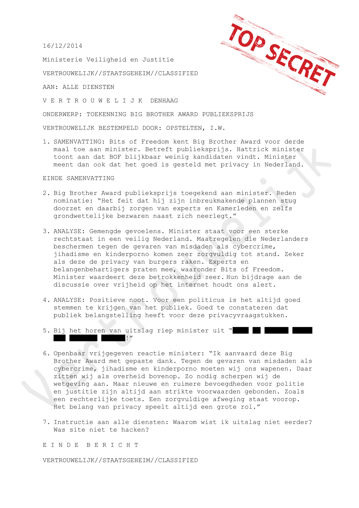 Het ministerie van Veiligheid en Justitie reageerde met een ‘gelekte cable’. Wij vonden het misplaatst dat de minister een grap maakt van zijn gebrek aan respect voor het recht op privacy. Het is immers het derde jaar en de vierde keer dat hij een Award kreeg. We vragen ons daarom af wanneer Opstelten Nederland eindelijk gaat vertellen wat het grondrecht op privacy volgens hem nog betekent.