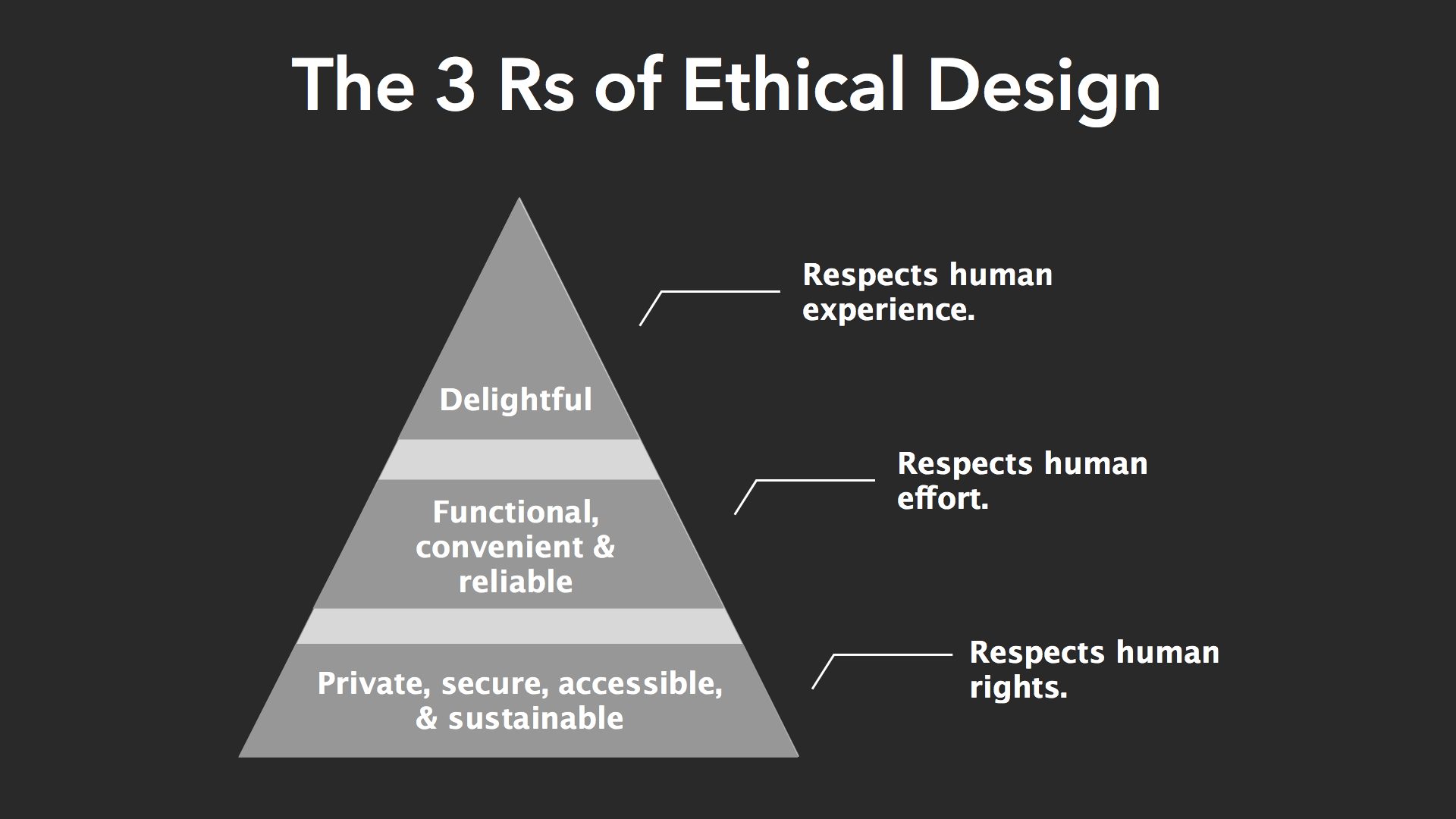 In zijn keynote speech gaf Aral Balkan aan dat commerciĆ«le bedrijven een vooruitgeschoven post van suveillerende overheden zijn. Ook schetste hij een alternatieve manier waarop online diensten ontwikkkeld kunnen worden. In zijn ‘piramide van drie R’en’ zijn diensten -in tegenstelling tot wat nu vaak het geval is – gebaseerd op respect voor mensenrechten.