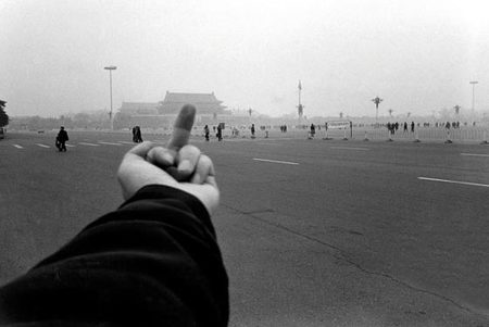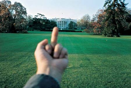 This reply to agression has been explored earlier by Ai Weiwei. In his ‘Studies of Perspective’ he gives the finger to the American government…