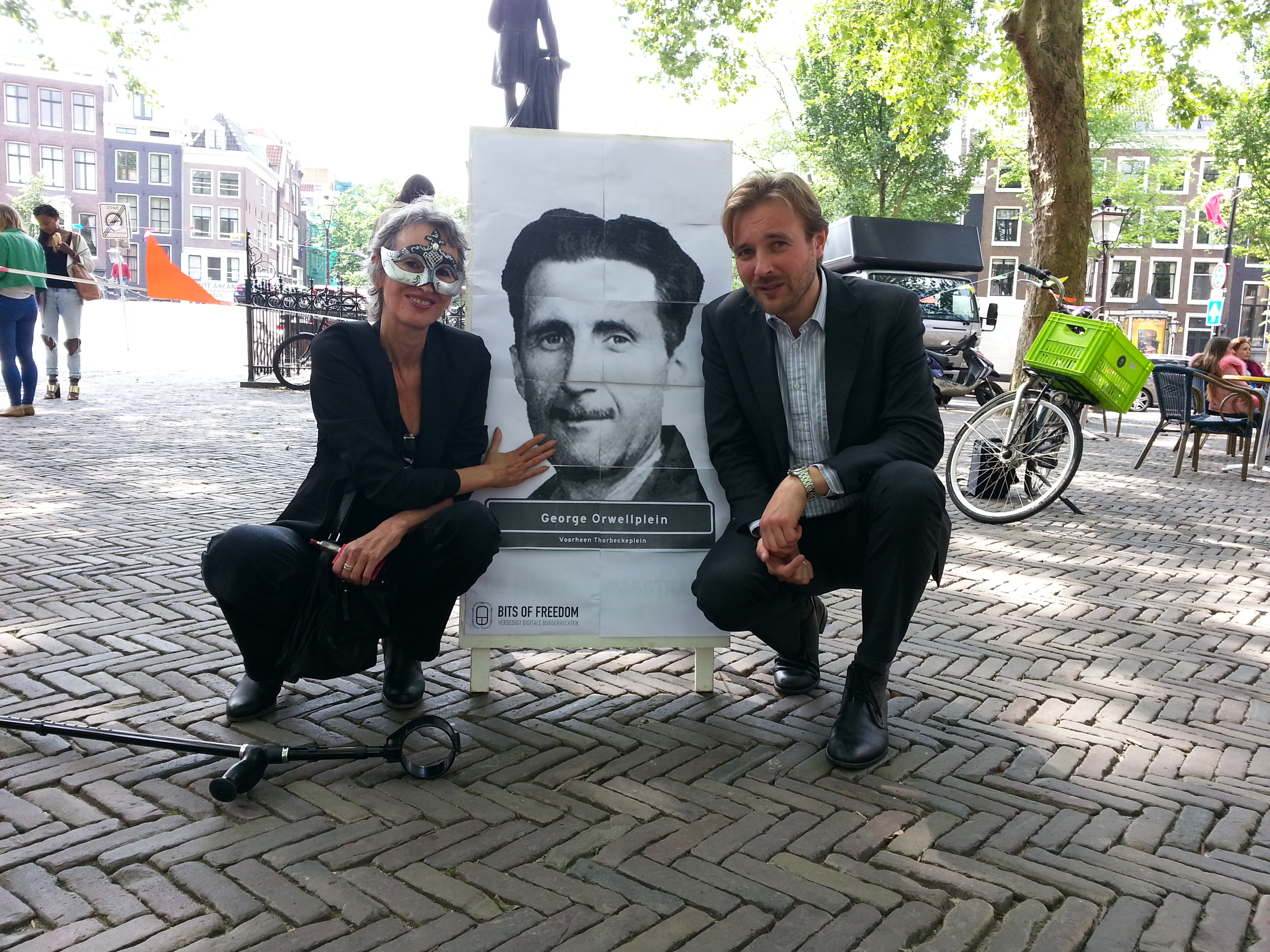 Vandaag riepen we het Thorbeckeplein in Amsterdam voor 30 minuten uit tot surveillance-vrij George Orwellplein. We zetten het plein met slingers af, mobiele telefoons konden op een veilige plek worden ingeleverd en de politiecamera’s werden afgedekt. Tientallen Amsterdammers grepen deze unieke kans aan om in de openbare ruimte in vrijheid te kunnen praten. (Die hebben we natuurlijk niet op de foto gezet.) Met deze ludieke actie vroegen we de aandacht voor toenemende overheidssurveillance. Hier zijn een paar plaatjes.