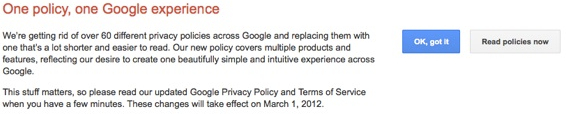 Op 1 maart 2012 kondigde Google nieuwe privacyvoorwaarden aan. Meer dan zestig verschillende voorwaarden van verschillende Google-diensten zijn toen samengevoegd in één set die gelden voor alle diensten van Google.
