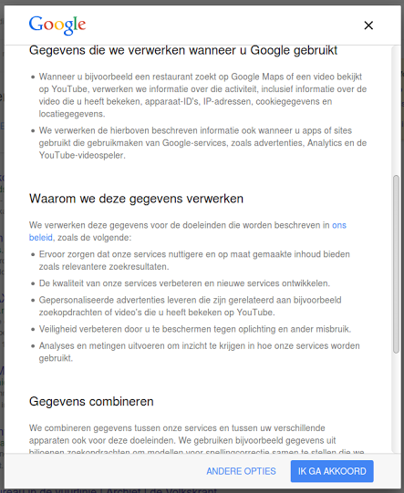 Om aan deze maatregelen gehoor te geven, heeft Google onlangs een pop-up laten zien met 'Privacy herinnering'. Deze pop-up verschijnt bij iedere gebruiker nadat met een Google-account is ingelogd (groep 1). Er wordt uitleg gegeven over welke gegevens worden verwerkt, waarom deze gegevens worden verwerkt en dat de verworven gegevens worden gecombineerd. Ook als wordt doorgeklikt naar 'bekijk informatie over hoe Google gegevens gebruikt om de gebruikservaring te verbeteren' wordt diegene geïnformeerd over hoe persoonlijke gegevens worden gebruikt, en – heel belangrijk – dat de gebruiker verschillende opties zelf kan aanpassen. Als vervolgens onderaan de pagina wordt geklikt op 'andere opties' bestaat de mogelijkheid tot aanpassen van gegevens uit zoekopties, advertentie-instellingen, YouTube en browser gebaseerde beheeropties.