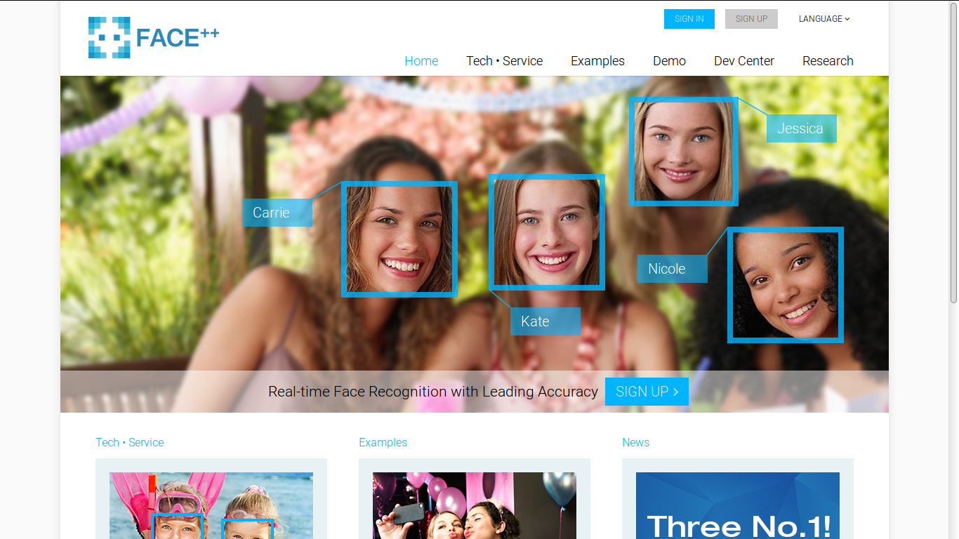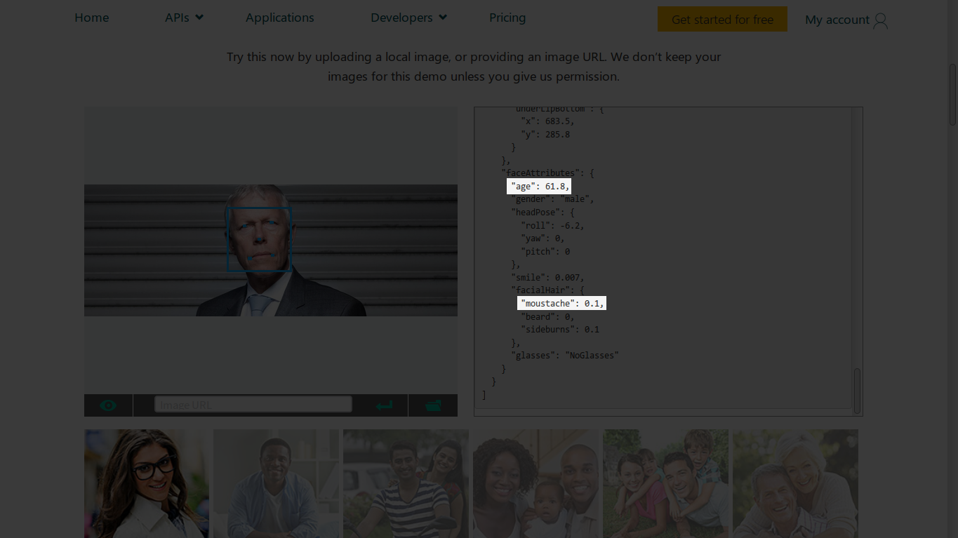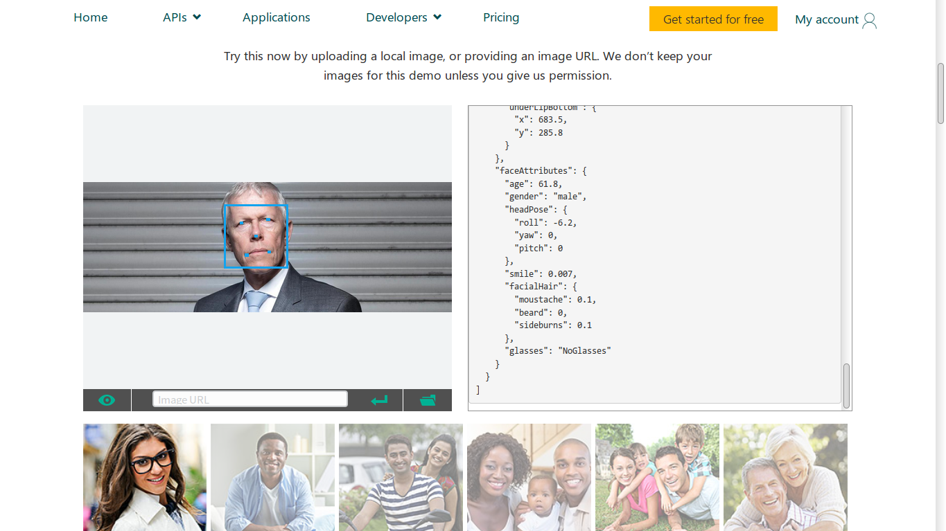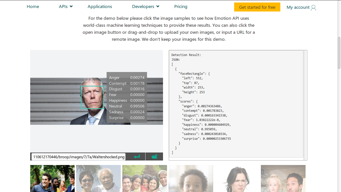 Het herkennen en analyseren van gezichten kun je inmiddels ook als dienst afnemen. Een soort kunstmatige intelligentie as a service. Bij Microsoft heet het Cognitive Services en kun je voor anderhalve dollar 1.000 gezichten analyseren. Dat ziet er ongeveer zo uit: