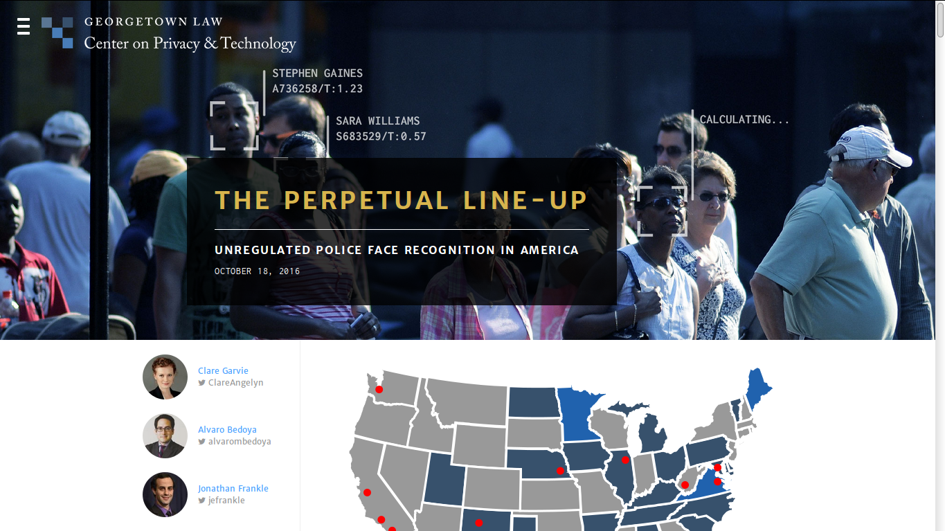 Het Georgetown Law Center on Privacy and Technology deed dit jaar onderzoek naar de database met gezichten die door de Amerikaanse politiediensten worden bijgehouden. Ze kwamen er achter dat foto’s van 117 miljoen Amerikanen in ongereguleerde databases van Amerikaanse politiecorpsen zitten. Deze mensen kunnen altijd geïdentificeerd worden. Ze noemen het de ‘perpetual line-up‘.