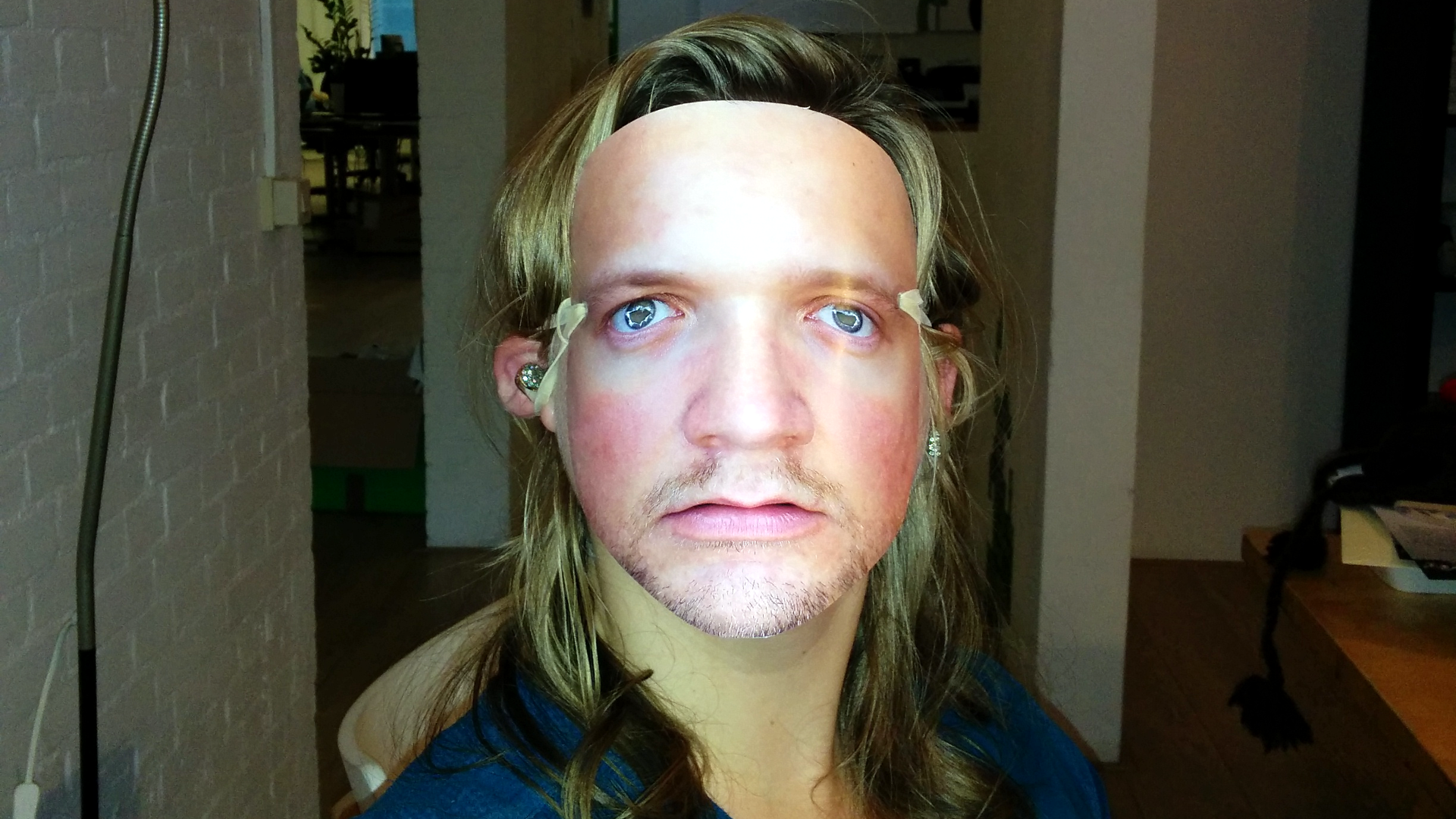 In onze tentoonstelling Rendering Realities —overigens hier in de Stadsschouwburg gratis te bekijken tot en met woensdagavond— wordt ook het project URME van Leonardo Selvaggio tentoongesteld. Leonardo heeft zijn eigen gezicht beschikbaar gesteld aan de wereld. In uw programmaboekje vind u wat hij zijn instapmodel noemt. Mijn collega demonstreert hier even hoe dat eruit ziet: