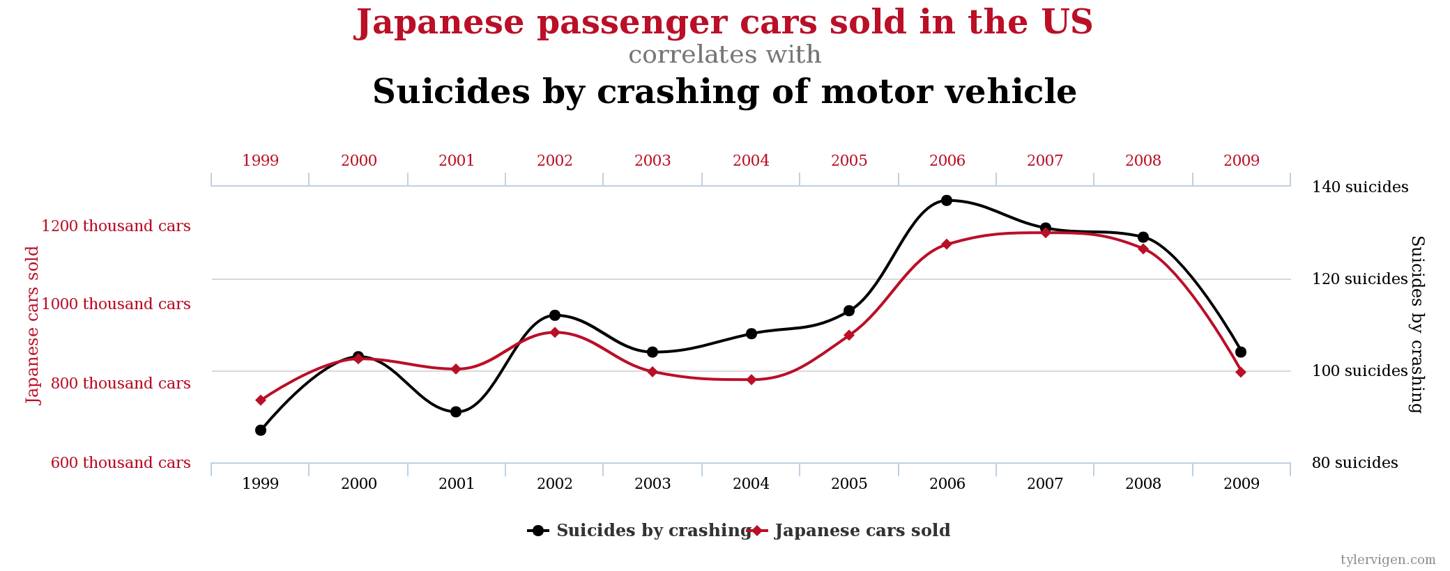 Zie bijvoorbeeld de veelzeggende grafieken van Tyler VigenMeer grafieken van Tyler Vigen vind je hier waarin verbanden worden weergegeven tussen twee willekeurige gebeurtenissen. Zoals het aantal verkochte Japanse auto’s en het aantal zelfmoorden met een gemotoriseerd voertuig in de VS: