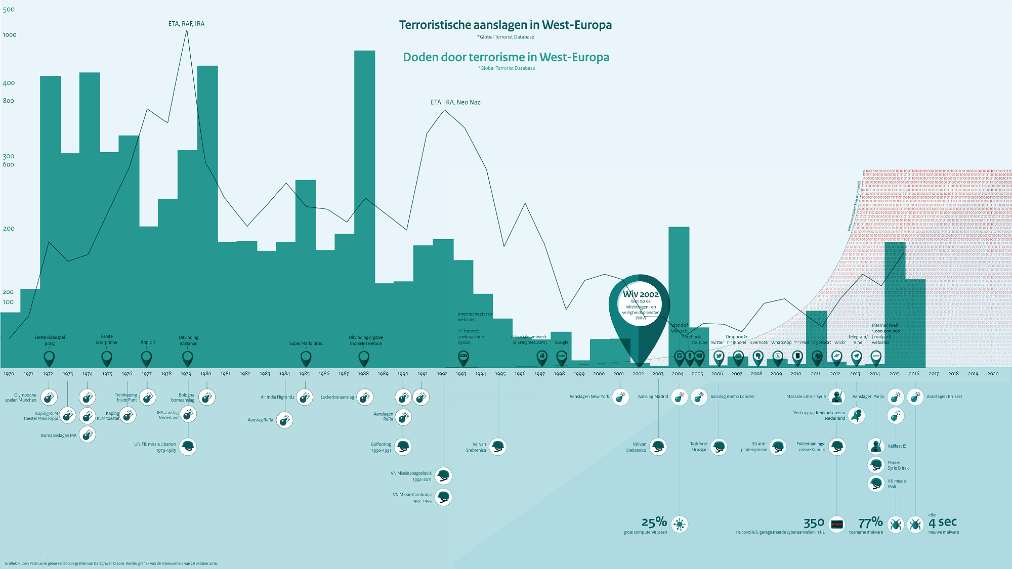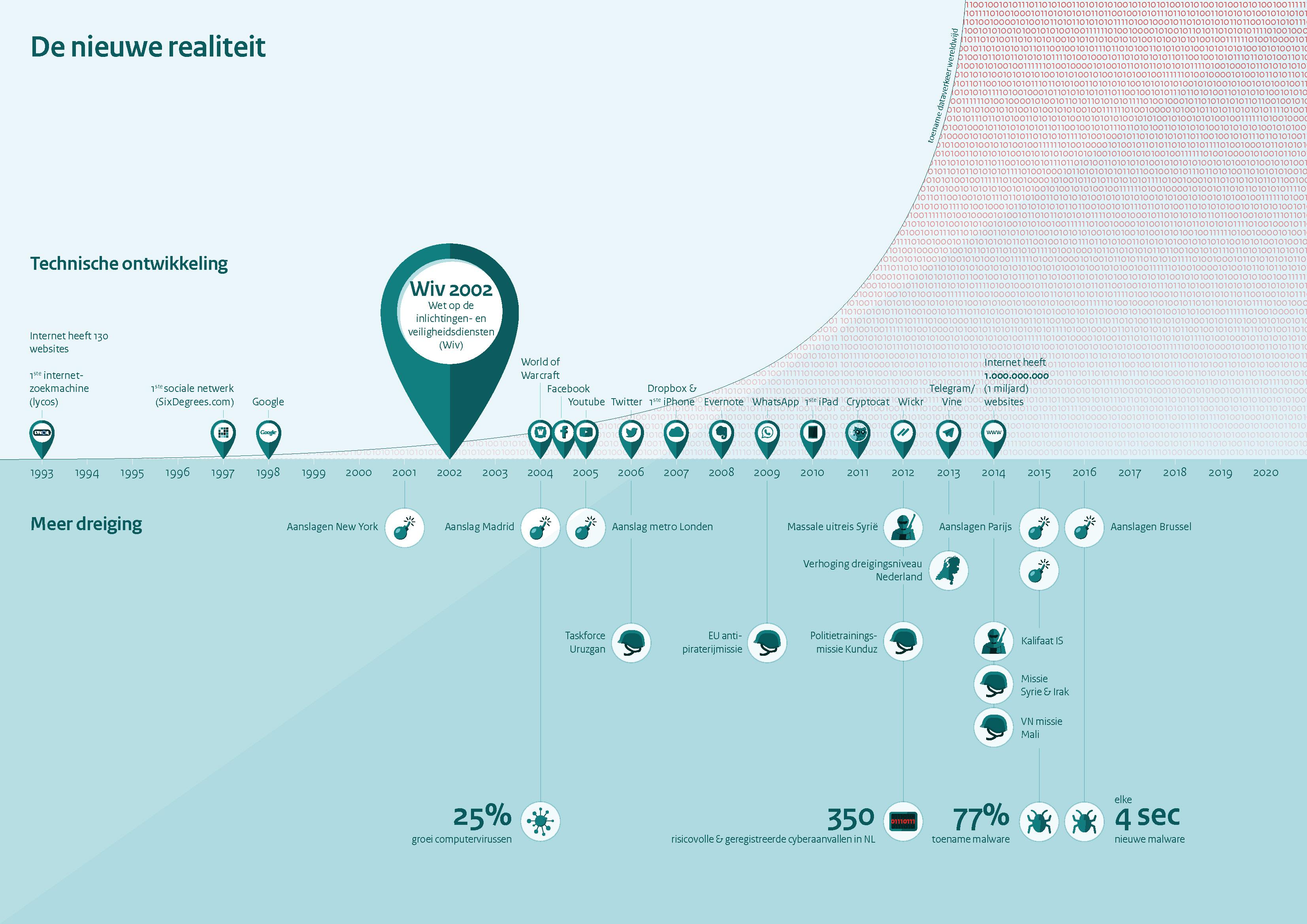 In deze grafiek wordt de ‘technische ontwikkeling’, zoals de introductie van de eerste iPhone, afgezet tegen een toename aan onrust over de periode 1993-2016. Dit zou ‘de nieuwe realiteit’ waarin we leven weergeven: een toename van de onrust sinds inwerkingtreding van de Wet op de inlichtingen- en veiligheidsdiensten in 2002.