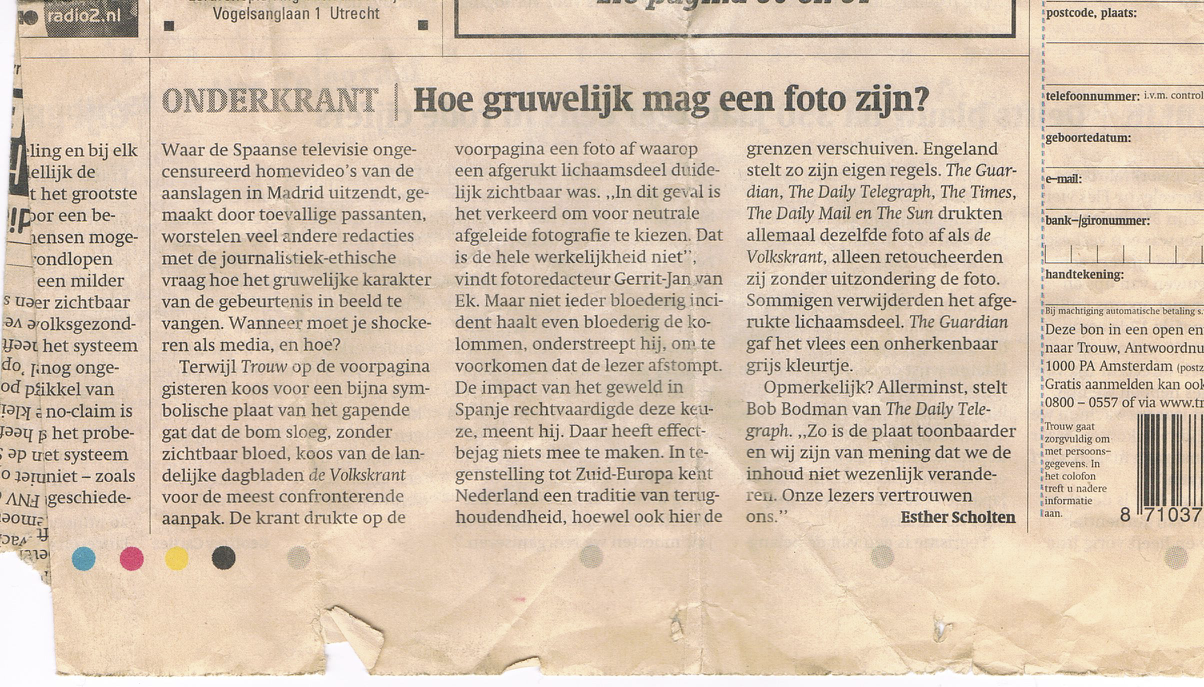 Een manier om dat mogelijk te maken is door terug te gaan naar een model waarbij je als gebruiker kan kiezen tussen een grote variëteit van aanbieders van soortgelijke diensten. Niet één Facebook, maar tientallen met elk een eigen profiel. Vergelijk het met de krant van vroeger. Sommige mensen waren tevreden met een abonnement op Trouw, anderen voelden zich meer thuis bij de Telegraaf. En waar de redactie van die laatste misschien een bepaald beeld wél op de voorpagina zette, maakt een andere redactie een andere keuze. Hoe gruwelijk mag een foto zijn?