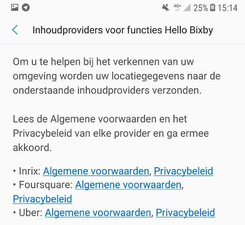 Dit is een screenshot van de voorwaarden waarmee je akkoord moet gaan bij activatie van Bixby op een Samsung Galaxy S8: