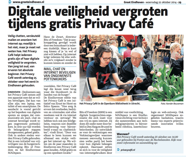 Het Privacy CaféDe Privacy Café website is een gratis toegankelijke workshop die op diverse locaties wordt georganiseerd. Het is de enige plek in Nederland waar mensen gratis terecht kunnen voor hulp bij het verbeteren van hun privacy en veiligheid online. Het is de enige plek die discussie over privacy combineert met de praktijk. Een bezoeker van het Privacy Café gaat naar huis met een veiligere laptop of smartphone. Daarom is het Privacy Café zo belangrijk.