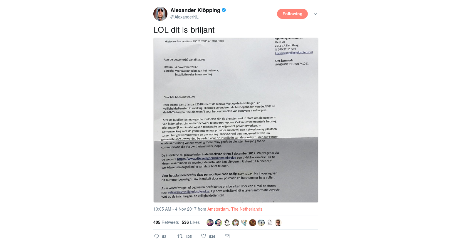 We gingen verder met een korte introductie vanuit Bits of Freedom en een update over hun toekomstplannen. Eén daarvan is dat op de dag van deze bijeenkomst er een campagne is gedaan waarbij 20.000 brieven zijn verstuurd. In deze brief staat vermeld dat er tussen 4 en 8 december 2017 een monteur komt namens de Rijksveiligheidsdienst die een netwerk-relay in je meterkast komt installeren zodat de overheid gemakkelijker toegang kan krijgen tot je privénetwerk. Deze organisatie bestaat natuurlijk helemaal niet maar zie hieronder de brief: