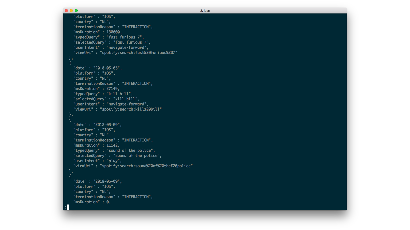 Het overzicht dat je krijgt is best interessant. Het is vergelijkbaar met gegevens die je kreeg toen je onder de oude regels een overzicht opvroeg. Je krijgt een overzicht van de muziek die je in de laatste drie maanden geluisterd hebt, waar je zoal op gezocht hebt, hoe je playlists er uit zien en welke andere gebruikers je volgt. Dat alles in een open, gestandaardiseerd format, dat, als je een beetje handig bent, met een programmaatje of bij een concurrerende dienst kunt inlezen. Yeah voor Spotify.