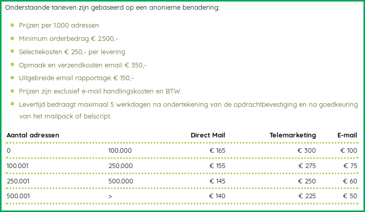 Tot voor kort kon je bij Mint MarketingZo ziet de pagina bij Mint Marketing er nu uit ook een prijslijst vinden. Een huisadres van een voetballer kost ongeveer 15 cent, een telefoonnummer gaat vanaf 22,5 cent, en als je veel e-mailadressen tegelijkertijd koopt dan heb je die al voor 5 cent per stuk: