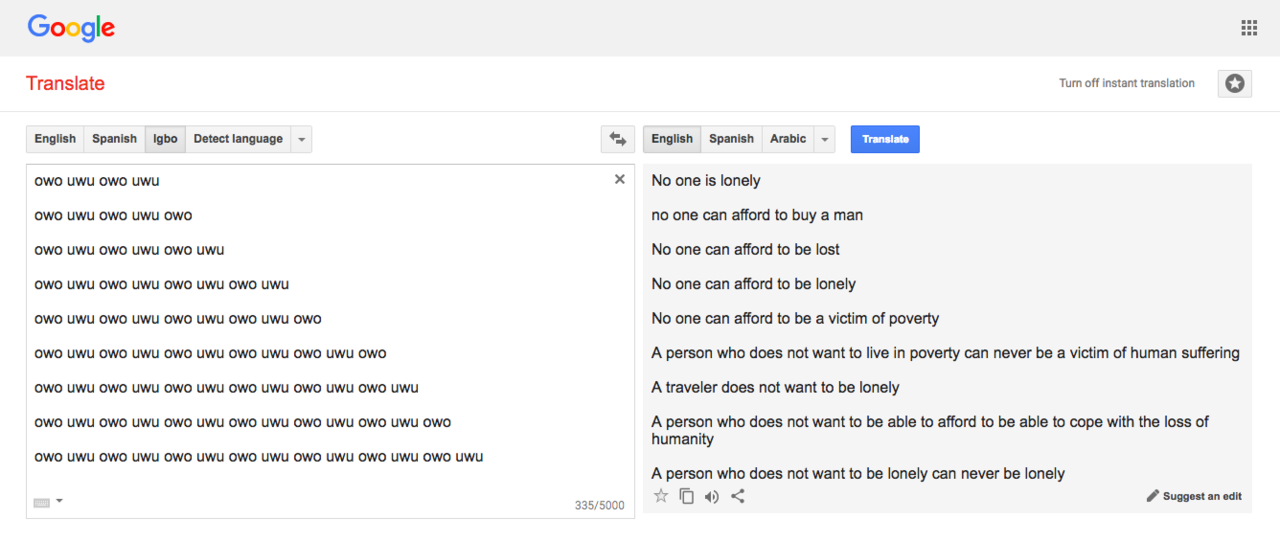 Het Igbo is blijkbaar een taal met bijzonder veel ambiguïteit. Kijk welke poëzie Google's algoritme hiervan weet te maken:
