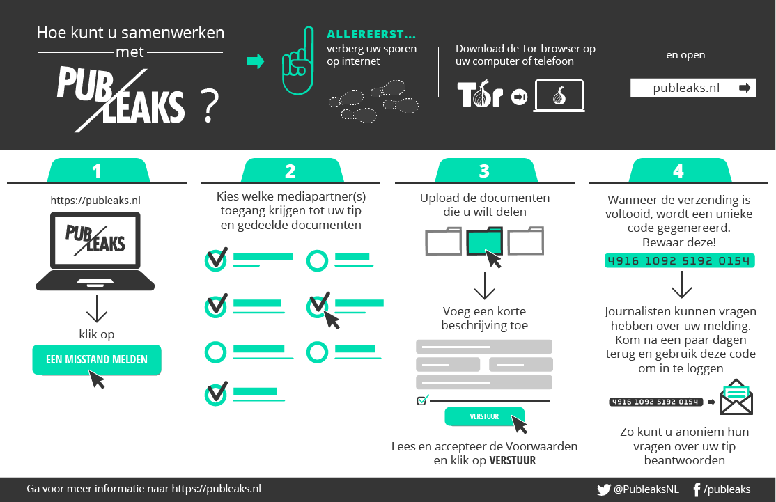Om klokkenluiders of ‘tipgevers’ die veiligheid te bieden en journalisten te helpen hun werk goed te doen bestaat er in Nederland Publeaks.nl. Dit is een platform waar mensen veilig kunnen lekken naar de Nederlandse pers. Publeaks is gebaseerd op de Open Source software van Globaleaks. Door middel van deze software worden wereldwijd klokkenluiders geholpen om de risico’s te beperken als ze misstanden willen lekken. Maar deze software alleen is niet voldoende. Het is daarnaast belangrijk dat tipgevers weten hoe ze hun eigen veiligheid kunnen waarborgen. Wat kan, en móet, je soms als tipgever zelf nog doen om jezelf te beschermen?