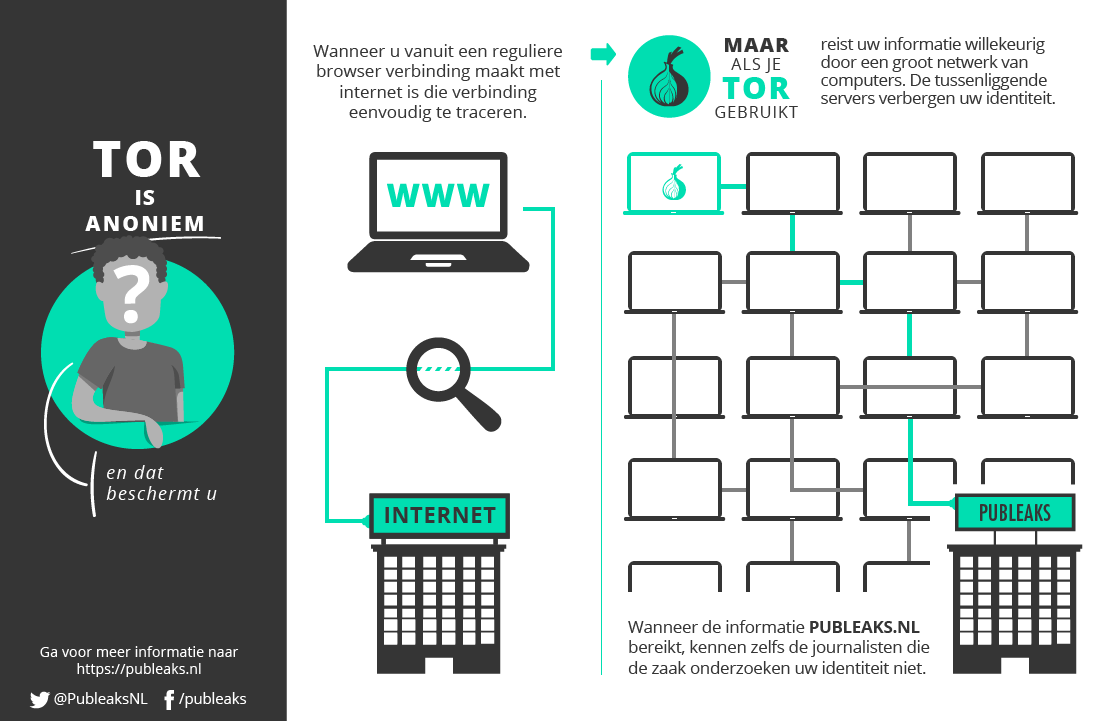 De eerste stap is om de Tor-browserDownload hier de Tor-browser te downloaden. Dit is een browser net zoals Firefox en Chrome, maar dan één waarbij jouw surfgedrag en identiteit minder makkelijk kan worden getraceerd. Als je Tor gebruikt reist je informatie namelijk willekeurig door een groot netwerk van computers. Hierdoor blijft de herkomst van de informatie, en dus jouw identiteit, verborgen. Vervolgens ga je naar de Publeaks website.
