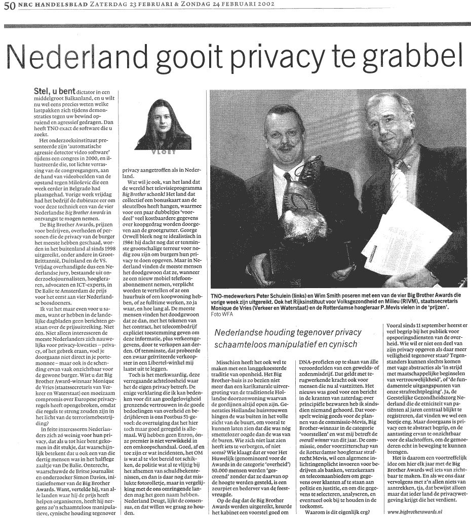 Publicatie in NRC Handelsblad van de eerste Big Brother Awards 2002 in De Balie Amsterdam. -