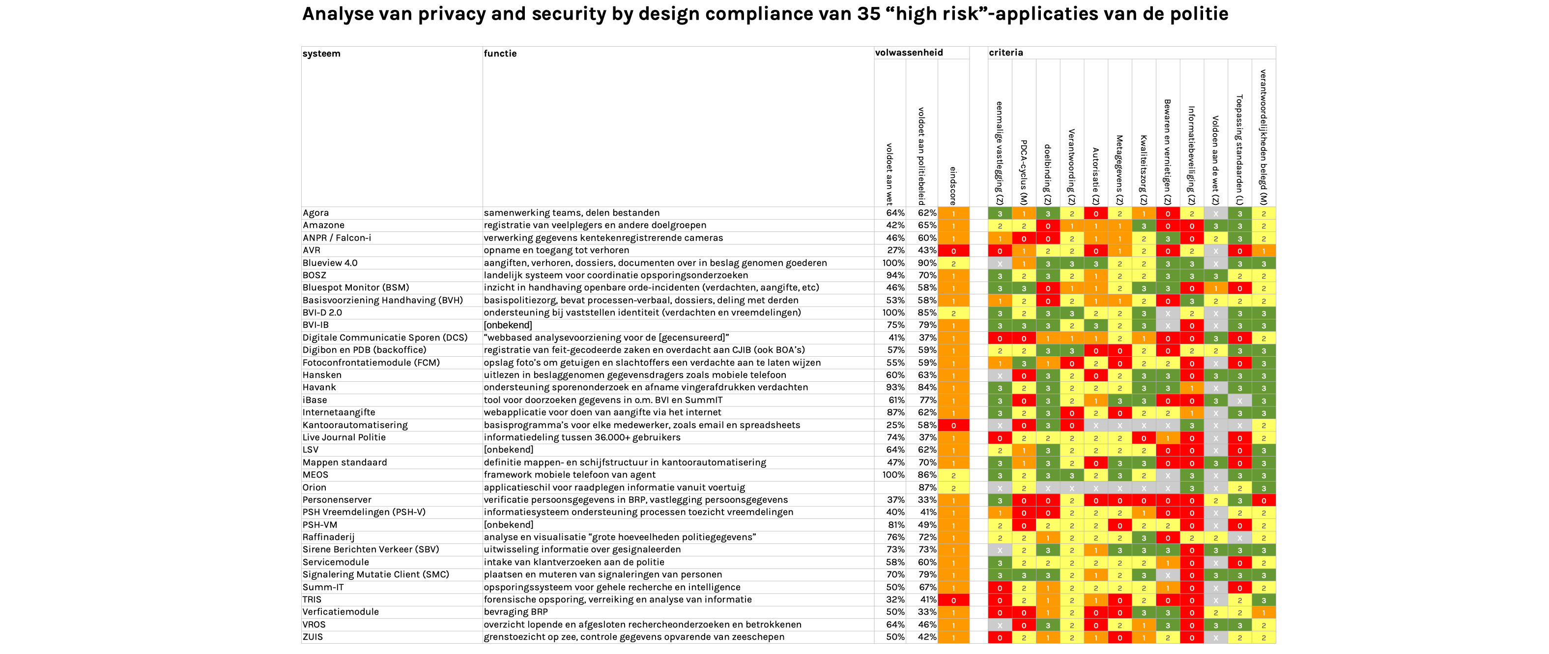 Het gaat om 36 systemenDe rapporten waarop deze analyse is gebaseerd, vind je onderin deze pagina die, naar eigen zeggen, "ten alle tijde draaiende moeten blijven, zodat de politie haar werk kan doen." Het zijn de systemen voor het registreren van veelplegers en kentekens, opnemen van aangiften en verhoren, uitwisselen van informatie tussen agenten, verwerken van vingerafdrukken, analyseren van grote bergen gevoelige gegevens en vele andere functies. Geen (!) van deze systemen voldoen aan de regels over privacy and security by design die volgen uit de wet en het beleid van de politie. Bij drie systemen is er zelfs helemaal "geen specifieke aandacht" hiervoor.