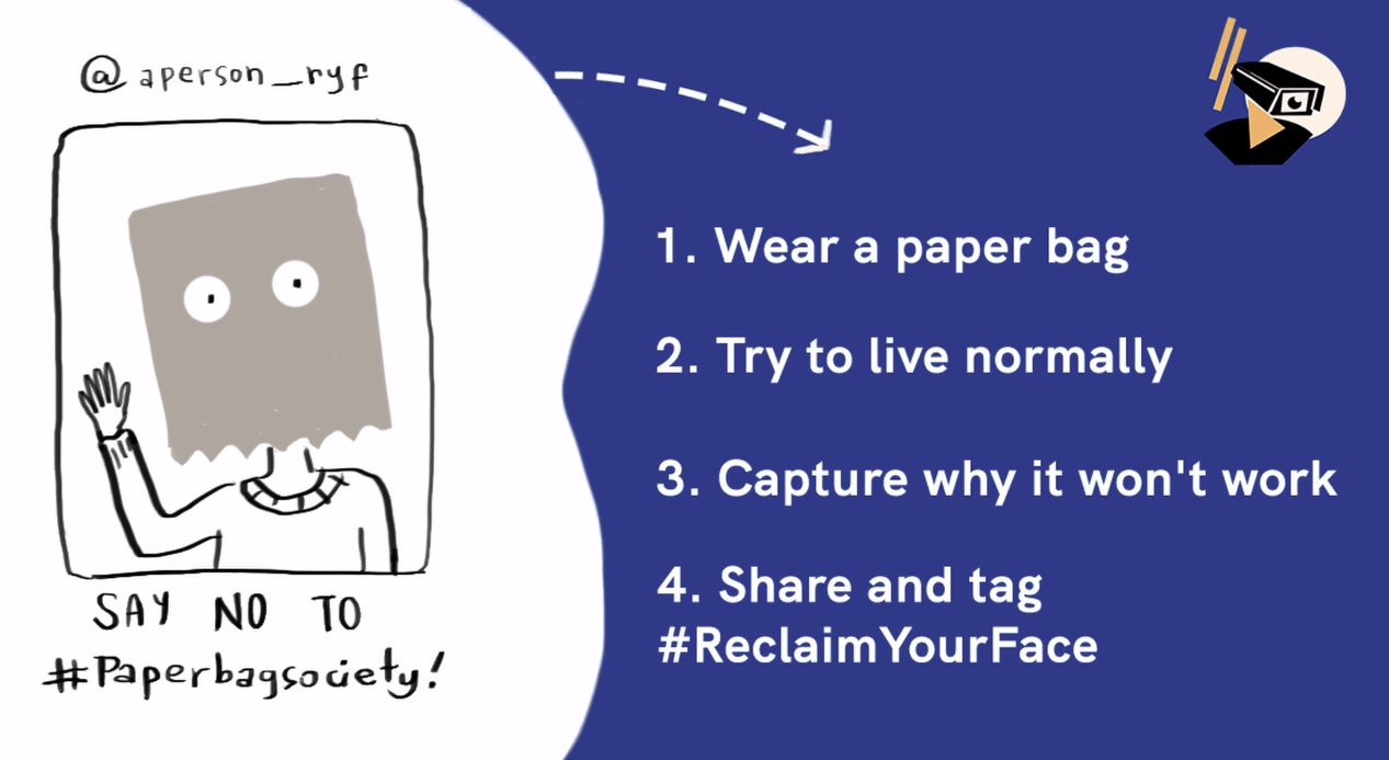 We willen geen papieren zakken samenleving, maar zolang er geen structurele oplossing is zijn we op dergelijke beschermingsmiddelen aangewezen. Zeg samen met ons "nee" tegen een #PaperBagSociety en deel waarom het voor jou niet werkt om te leven met een papieren zak op je hoofd. Roep samen met ons op tot een verbod op biometrische surveillance in de openbare ruimte!