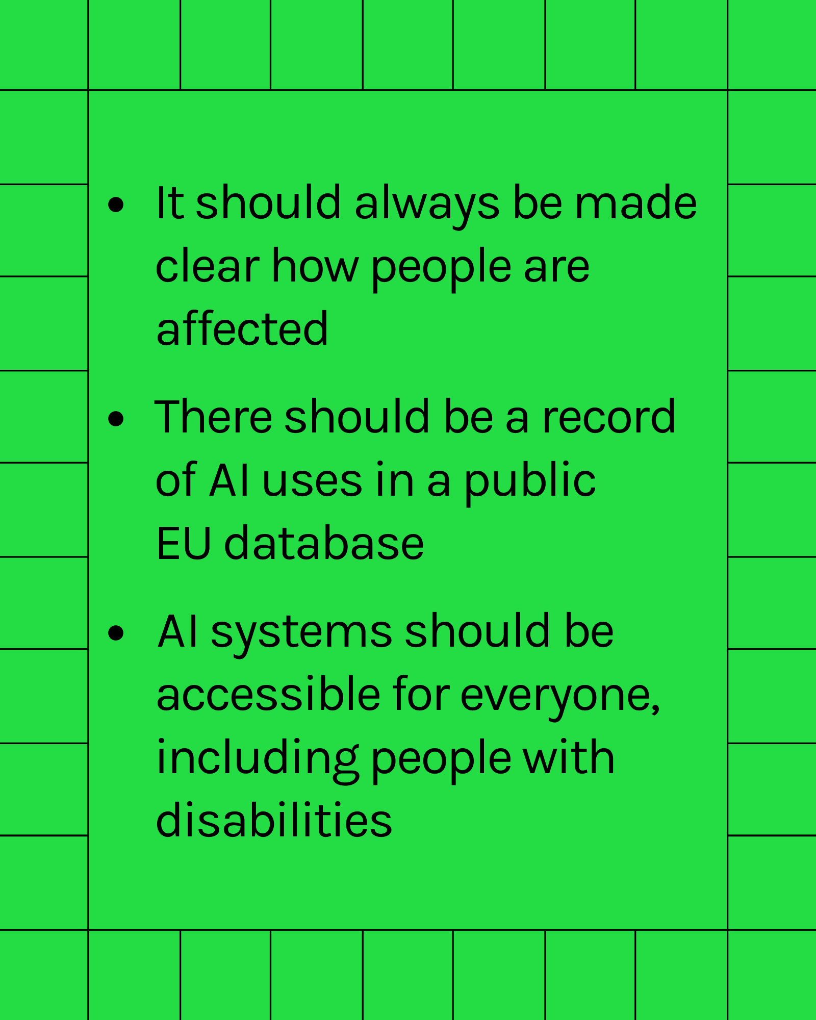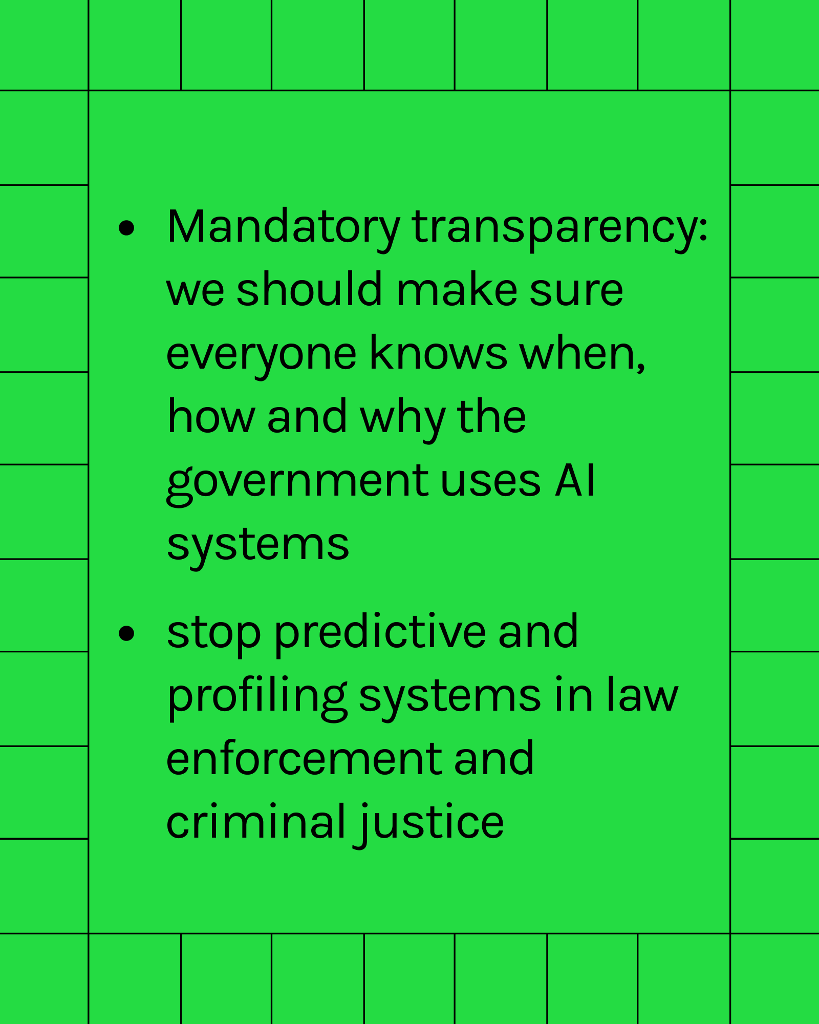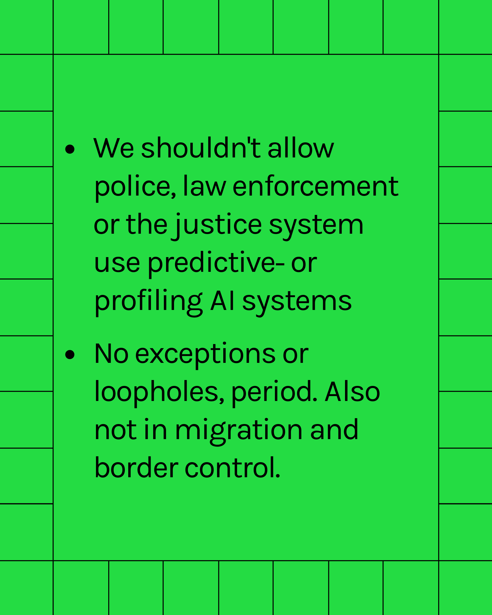 These are the things that we need to see changed in the AI Act to protect human rights. Use the download buttons (right mouse button > Save as...) to share the materials on your own channels.