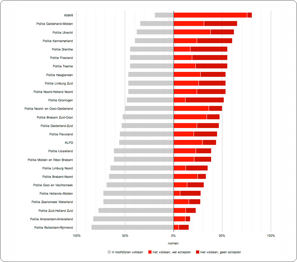 Geen enkel korps voldoet aan alle wettelijke regels. De Koninklijke Marechaussee scoort het slechtste: zij leeft minder dan twintig procent van de normen na en dan nog slechts “op hoofdlijnen”. Twaalf korpsen halen voor minstens de helft van de criteria het niveau “voldoet op hoofdlijnen” niet. Slechts drie korpsen weten op meer dan driekwart van de normen een voldoende te scoren. De twee grootste korpsen van het land hebben het beleid nog het beste op orde en laten op “slechts” één vijfde van de normen steken vallen.