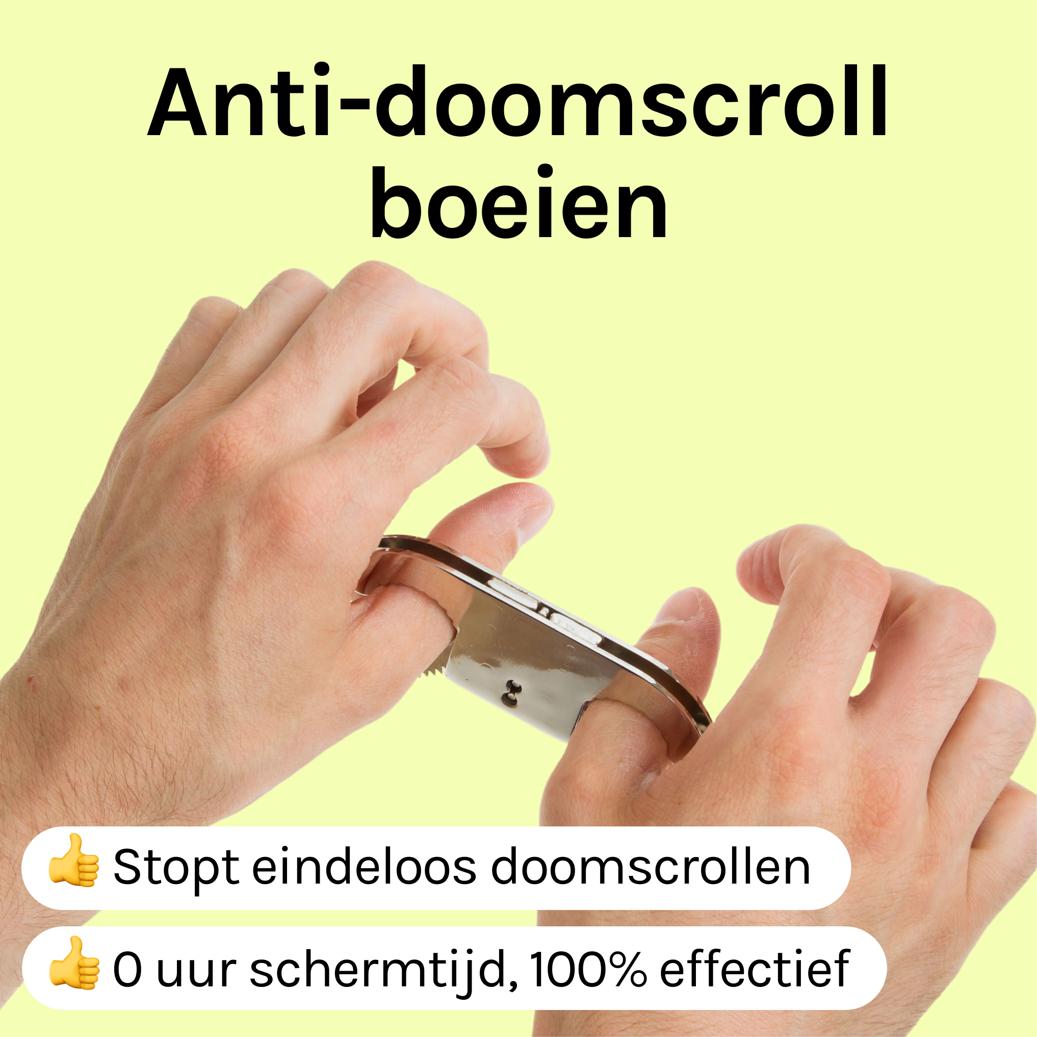 …was het maar zo makkelijk, hè? Dit is natuurlijk een 1 april grapje. We verkopen deze anti-doomscroll boeien dus niet echt, maar we werken wel aan een écht effectieve oplossing voor het verslavend ontwerp van socialemediaplatformen. Het wordt hoog tijd dat we de sensatiebeluste algoritmen van Big Tech aan banden leggen. We kunnen jouw steun daarbij goed gebruiken. Support onze strijd met een donatie.