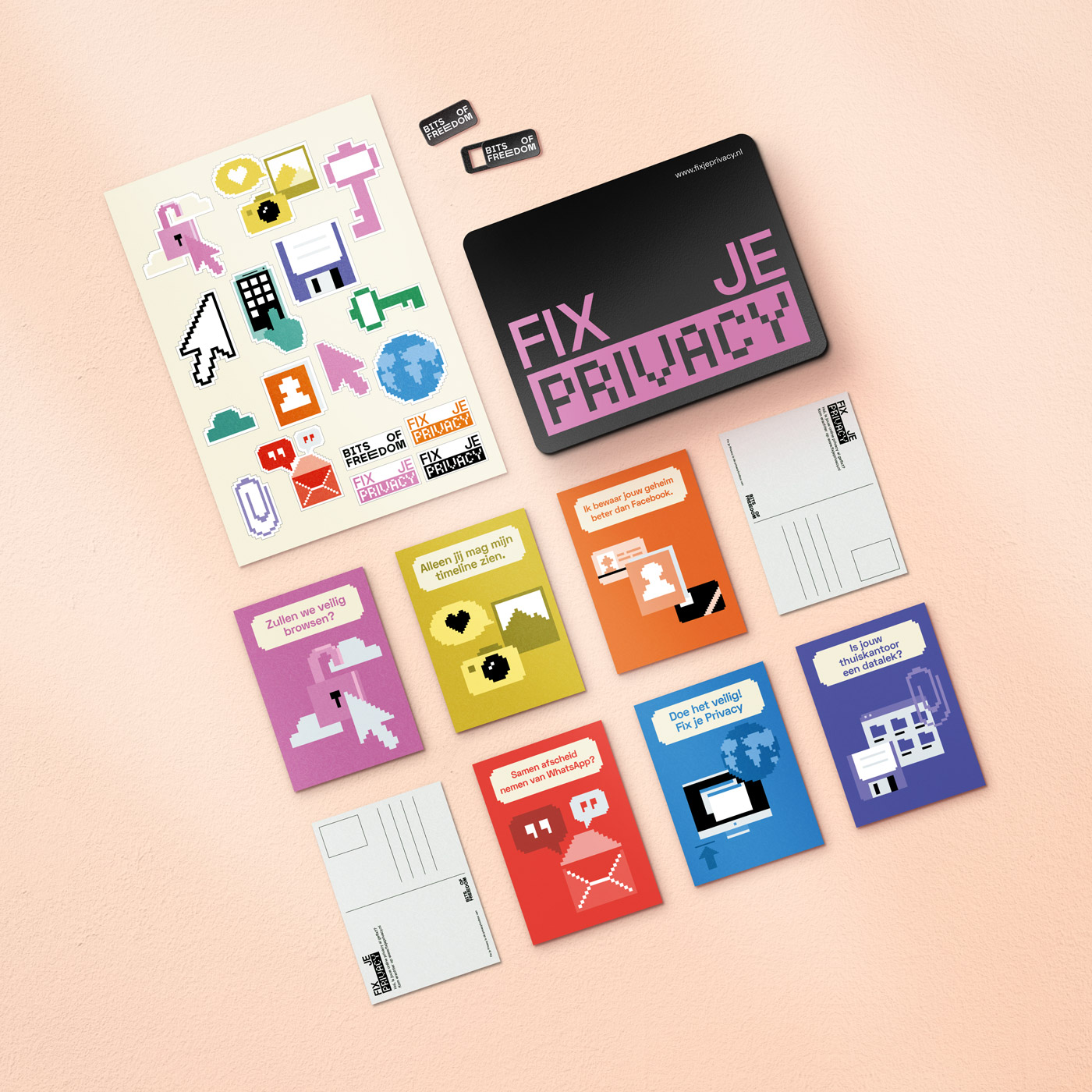 Je krijgt een webcamcover, een stickerset voor de decoratie van bijvoorbeeld je fiets of laptop, een muismat om je dagelijks aan het belang van je privacy te herinneren en een setje ansichtkaarten om de het belang van privacy bij iemand anders te laten landen. Met jouw aankoop ondersteun je ons werk en dus de toolbox!