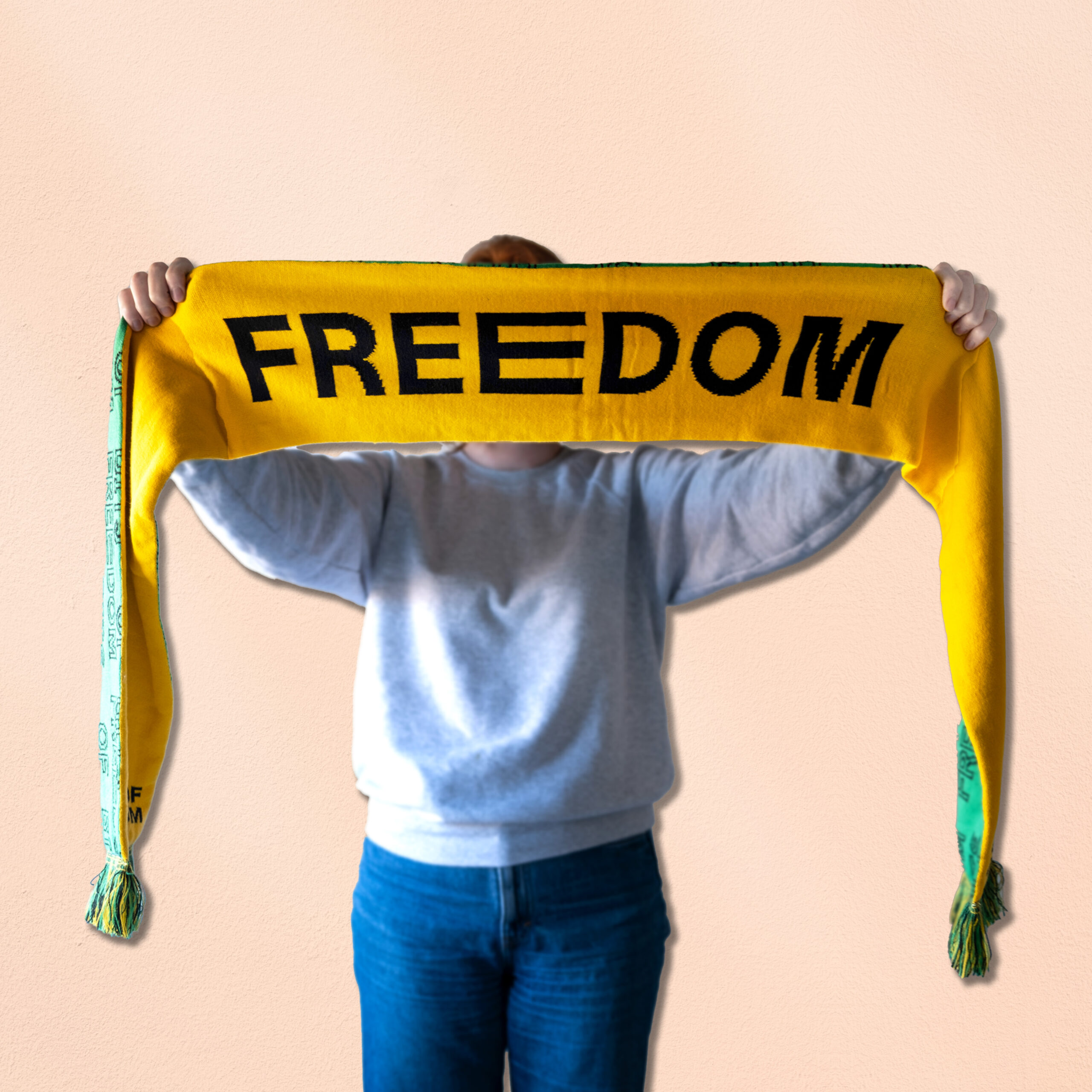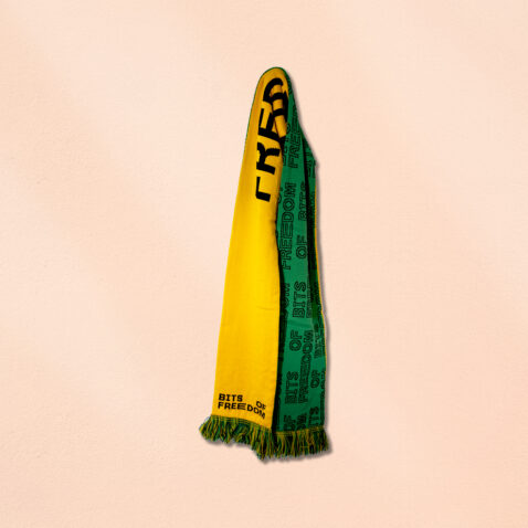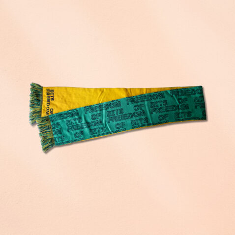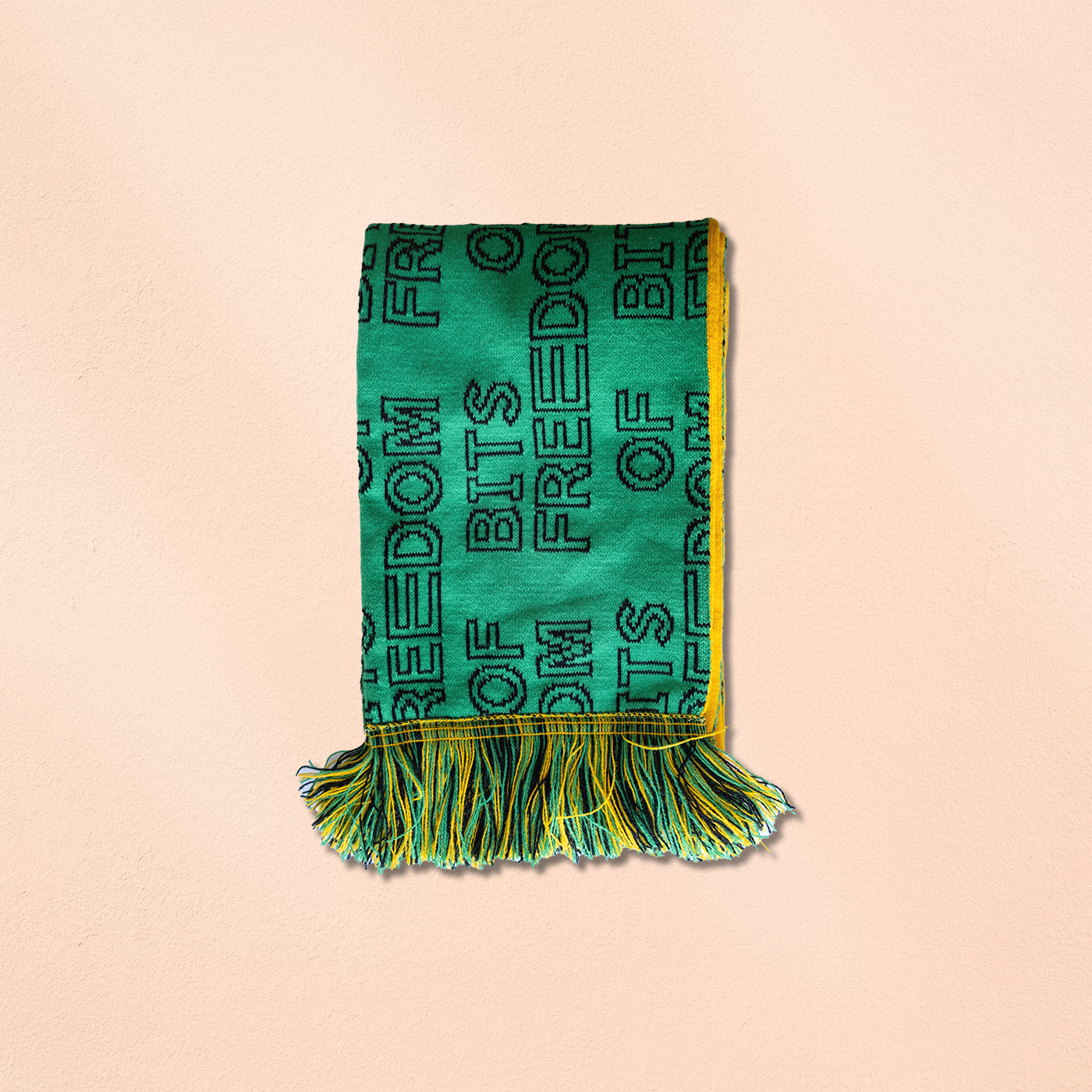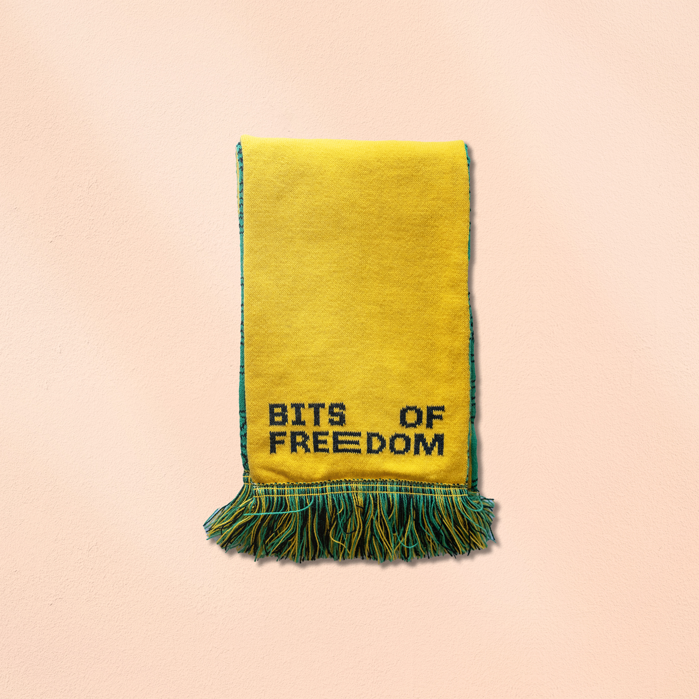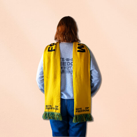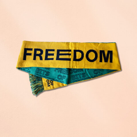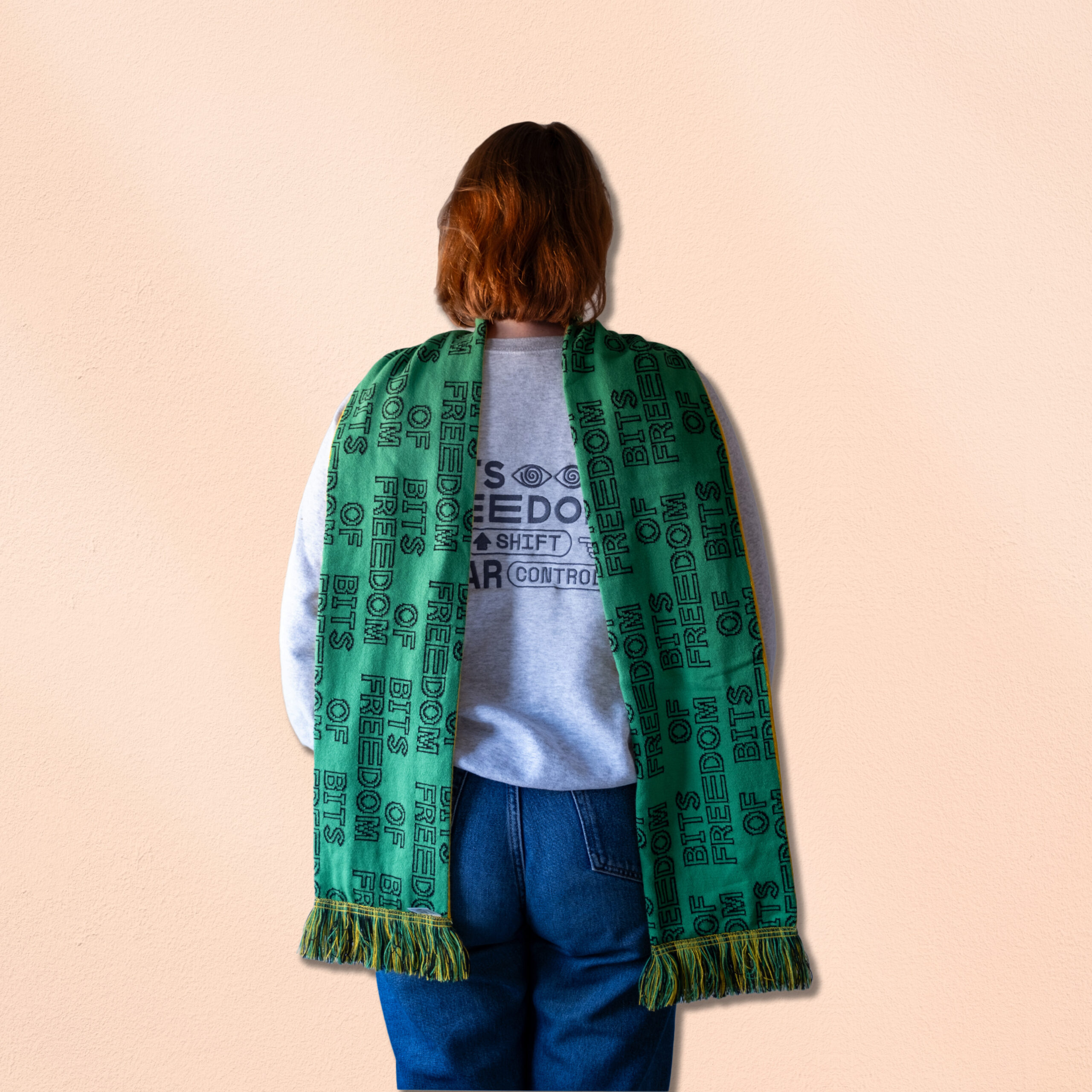 Aan de ene zijde schreeuwt de sjaal FREEDOM, draai je de sjaal om, dan vind je het logo van Bits of Freedom in rustgevend groen. Geproduceerd in de EU, 100% acryl, een heerlijk zacht statement.